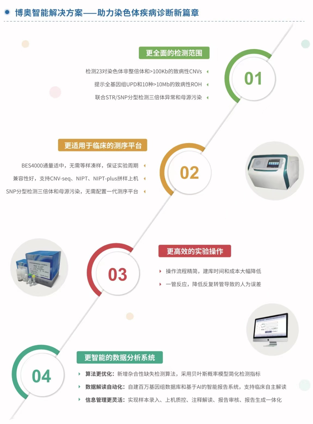 博奧晶典CNV-seq系列產品全面升級,在原有產品檢測23對染色體非整倍體、100Kb以上缺失/重復的基礎上,新開發(fā)了特有的生信算法并獲得專利授權,新增基因組純合區(qū)域ROH檢測,可提示全基因組UPD和10種>10Mb的致病性ROH;此外,博奧晶典自主研發(fā)的基于BES4000的SNP分型技術有效提示三倍體異常和定量鑒定5%以上的樣本交叉污染,為臨床提供更具性價比的檢測產品,為出生缺陷精準防控提供更全面的解決方案。