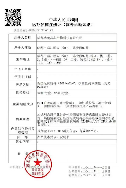 2022年11月4日,博奧晶典新冠病毒核酸檢測整體解決方案再添新成果,凍干型高靈敏度的新型冠狀病毒(2019-nCoV)核酸檢測試劑盒 (熒光PCR法)正式獲得醫(yī)療器械注冊證(國械注準(zhǔn):20223401469)。這是國家藥品監(jiān)督管理局審批通過的首個(gè)凍干型新冠病毒核酸檢測試劑盒,同時(shí)具備中國NMPA和歐洲CE“雙證”,為堅(jiān)持“動(dòng)態(tài)清零”,全面加強(qiáng)常態(tài)化疫情防控能力建設(shè)提供全新戰(zhàn)疫利器。