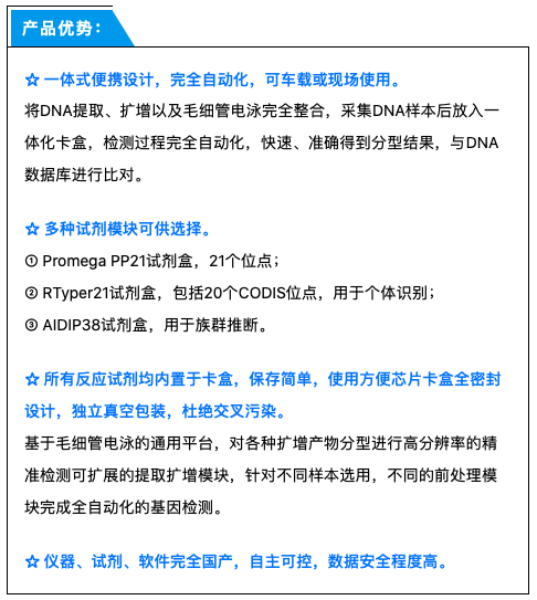 該系統(tǒng)基于微流控芯片技術(shù),配套全集成芯片卡盒和數(shù)據(jù)分析軟件,集DNA提取、PCR擴(kuò)增、毛細(xì)管電泳于一體,自動(dòng)生成分型結(jié)果,2小時(shí)即可獲得DNA分型。既可用于重大事故、自然災(zāi)害的人員身份快速識(shí)別和案件現(xiàn)場(chǎng)檢材的快檢快篩,也可用于邊防、公安等基層機(jī)關(guān)對(duì)敏感、可疑人員身份的快速識(shí)別和排查。儀器操作簡(jiǎn)單便捷,無(wú)需專業(yè)技術(shù)人員操作,可檢測(cè)的樣本包括:血卡、唾液卡、口腔拭子卡等。無(wú)使用環(huán)境要求,既可在實(shí)驗(yàn)室、辦公室、窗口單位,也可與警用現(xiàn)勘車配套移動(dòng)式檢測(cè),具有良好的抗震性、防污染措施,使用無(wú)需校準(zhǔn)。同時(shí)兼容多款國(guó)內(nèi)外DNA試劑,具備個(gè)體識(shí)別和族群推斷功能。