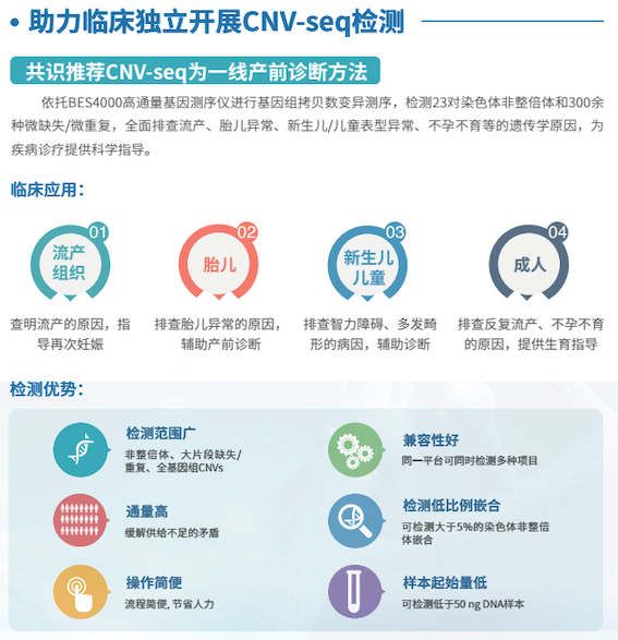 王教授詳細(xì)介紹了博奧基于BES4000平臺(tái)的CNV-seq技術(shù),指出在產(chǎn)前診斷領(lǐng)域引入STR(short tandem repeat,短片段重復(fù)序列)分析的CNV-seq(+)技術(shù),不僅可有效排除母源污染,還可高效檢出三倍體和UPD,提高陽(yáng)性檢出率。2019年4月發(fā)布的《低深度全基因組測(cè)序技術(shù)在產(chǎn)前診斷中的應(yīng)用專家共識(shí)》指出,具備條件的產(chǎn)前診斷機(jī)構(gòu)可將CNV-seq作為一線產(chǎn)前診斷技術(shù)應(yīng)用于臨床。CNV-seq技術(shù)不僅能輔助臨床判斷胎兒是否存在染色體異常,還能提高復(fù)發(fā)性流產(chǎn)夫婦染色體異常檢出率。