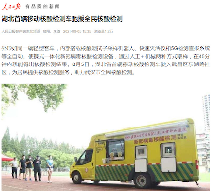 作為科技抗疫的標(biāo)志性成果,新冠病毒核酸檢測移動實驗室可以讓核酸檢測更加準(zhǔn)確便捷,安全快速,接通220V民用電或啟動車上自帶的發(fā)電機(jī)即可正常工作,采樣可通過口咽拭子采樣機(jī)械臂和人工兩種方式完成。其裝載的全集成芯片實驗室系統(tǒng)45分鐘即可完成全程實驗,最快35分鐘報告陽性結(jié)果,檢測靈敏度可達(dá)150拷貝/毫升。如此出色的性能使其特別適合在社區(qū)發(fā)生聚集性疫情和縣鄉(xiāng)村等醫(yī)療條件相對較差的場景下發(fā)揮優(yōu)勢。在為市民完成檢測后,檢測結(jié)果會通過5G通信系統(tǒng)實時上傳到醫(yī)院的核酸檢測實驗室,經(jīng)過審核后上報武漢市衛(wèi)健委的核酸檢測系統(tǒng)?!拜p騎兵”每天可以完成近800份樣品的檢測,為武漢市全民核酸檢測提供有力支持,在此次武漢疫情中發(fā)揮了積極作用。