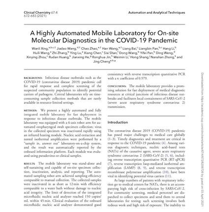 這一抗疫利器的研發(fā)成果以題為"A Highly Automated Mobile Laboratory for On-site Molecular Diagnostics in the COVID-19 Pandemic"的研究論文于2020年4月在國際檢驗醫(yī)學(xué)界權(quán)威雜志《臨床化學(xué)》(Clinical Chemistry)重磅發(fā)表,該論文詳細(xì)闡述了“輕騎兵”的性能特點和檢測能力等成果,得到了國內(nèi)外廣泛關(guān)注。該項重量級抗疫攻關(guān)科研成果的發(fā)表,為新冠病毒核酸檢測移動實驗室快速部署醫(yī)療診斷系統(tǒng)提供了一種有發(fā)展前景的解決方案,有助于控制新冠病毒的區(qū)域性傳播。