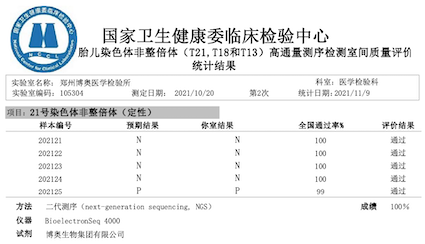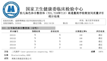 室間質(zhì)評(píng)是國(guó)家衛(wèi)生健康委臨床檢驗(yàn)中心對(duì)全國(guó)臨床檢驗(yàn)室間質(zhì)量評(píng)價(jià)活動(dòng),是衛(wèi)生行政部門和醫(yī)院管理者對(duì)實(shí)驗(yàn)室質(zhì)量實(shí)施監(jiān)督的重要工具,為保證和提高我國(guó)臨床檢驗(yàn)質(zhì)量,推進(jìn)臨床檢驗(yàn)規(guī)范化,起到非常重要積極的作用。本次考核基于博奧晶典研發(fā)的BioelectronSeq 4000基因測(cè)序儀平臺(tái)和胎兒染色體非整倍體(T21、T18、T13)檢測(cè)試劑盒(半導(dǎo)體測(cè)序法)開展,充分證明了博奧晶典無(wú)創(chuàng)產(chǎn)前基因檢測(cè)(Noninvasive Prenatal Testing,簡(jiǎn)稱NIPT)的高質(zhì)量檢測(cè)水平。