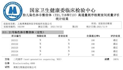 近日,國(guó)家衛(wèi)生健康委臨床檢驗(yàn)中心發(fā)布了《2021年外周血胎兒染色體非整倍體(T21,T18和T13)高通量測(cè)序檢測(cè)室間質(zhì)量評(píng)價(jià)結(jié)果》,博奧晶典旗下北京、廣東、成都等11家檢驗(yàn)實(shí)驗(yàn)室全滿分通過(guò)。
