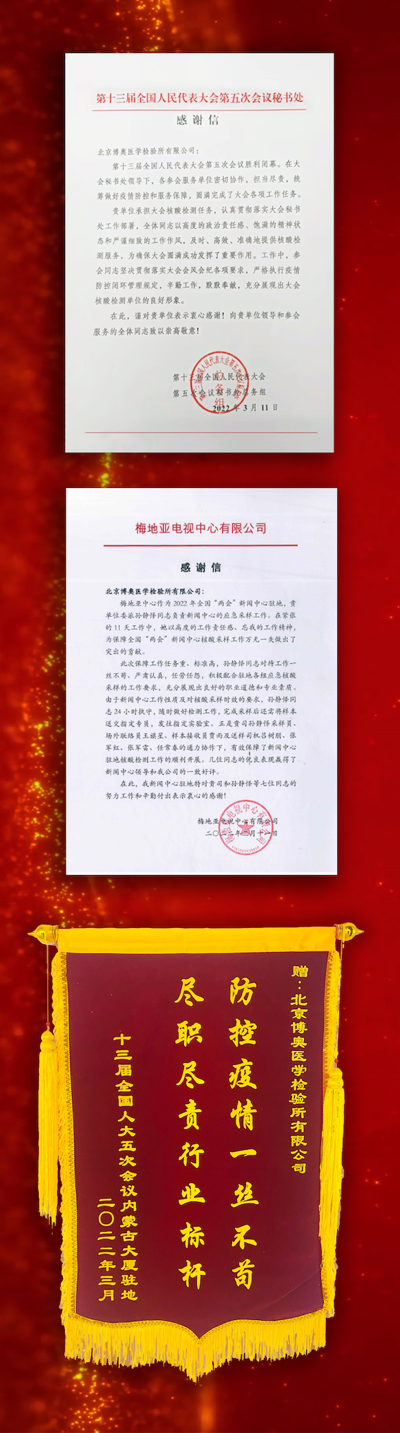 為此,博奧晶典旗下北京博奧醫(yī)學(xué)檢驗所收到了來自全國人大第五次會議秘書處、全國兩會新聞中心駐地梅地亞電視中心的感謝信及全國人大五次會議內(nèi)蒙古大廈駐地的致敬錦旗。