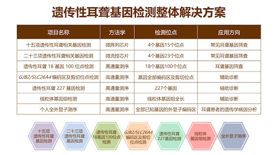 博奧晶典遺傳性耳聾相關(guān)基因檢測芯片的不斷升級迭代,有助于篩查出更多致聾基因變異人群,盡早為其提供生活指導(dǎo),降低耳聾發(fā)生風(fēng)險,早診斷、早干預(yù)、早治療。目前,博奧晶典已推出基于微陣列芯片、微流控芯片及高通量測序平臺一系列產(chǎn)品及服務(wù),包括:十五項(xiàng)遺傳性耳聾基因檢測、二十三項(xiàng)遺傳性耳聾相關(guān)基因檢測、藥物性耳聾基因檢測、遺傳性耳聾基因檢測(100項(xiàng))、遺傳性耳聾基因檢測(227個基因)、線粒體基因組檢測、全外顯子組基因檢測等,為備孕期及孕早期夫婦、新生兒及聽障人群提供最佳的篩查、診斷方案,同時提供專業(yè)的報告解讀及后續(xù)遺傳咨詢服務(wù),以實(shí)際行動全面助力耳聾三級防控,減少聾兒的發(fā)生。