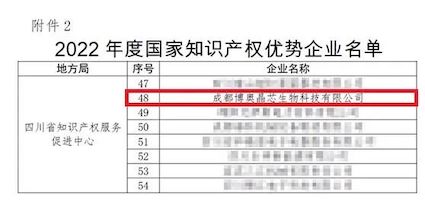 近日,國家知識產(chǎn)權(quán)局發(fā)布了“2022年度國家知識產(chǎn)權(quán)優(yōu)勢企業(yè)”評定結(jié)果公示。經(jīng)企業(yè)測評、推薦上報、省市專家審核確認(rèn)等嚴(yán)格篩選程序,博奧晶典旗下成都博奧晶芯生物科技有限公司(以下簡稱:博奧晶芯)憑借在知識產(chǎn)權(quán)創(chuàng)造、運用、保護和管理方面的優(yōu)勢,榮獲“2022年度國家知識產(chǎn)權(quán)優(yōu)勢企業(yè)”稱號。